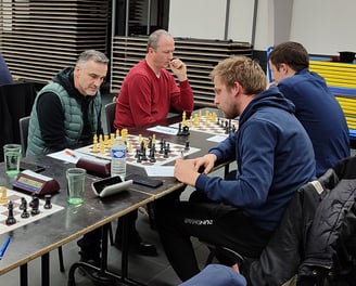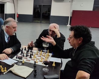 Le partage du point entre Benjamin et Marcel entraine un regroupement en tête: 4 joueurs ont maintenant deux points et demi. La prévision de la première ronde se réalise: les nouveaux n'ont aucun respect pour les anciens: Yannick, Guillaume et Justin ont respectivement battu Georges, Antonio et Jan.
